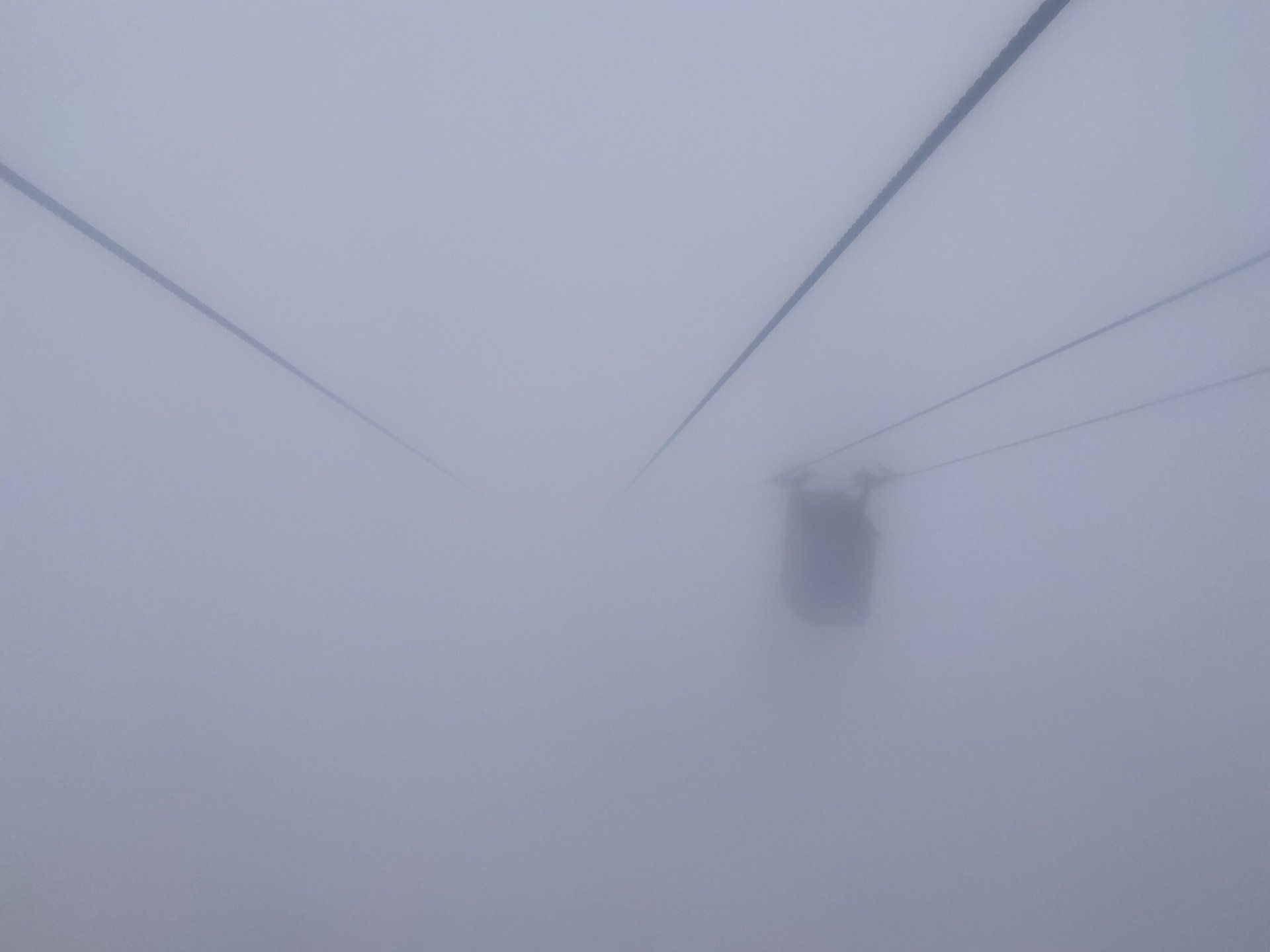 Derzeit ist es noch trocken, doch bald verschwindet die Gondel, oder besser verschwinden die Gondeln der unterschiedlichen Ebenen in den Wolken. Oben auf dem nächsten Punkt, der Valluga angekommen, befindet sich eine Aussichtsplattform mit Tafeln, die die umgebenden Gipfel zeigen. So sind auch Wildspitze (3.772 m) und Piz Buin (3.312 m) dabei ... und nein, Piz Buin ist nicht nur ein Sonnenschutzmittel, es gibt auch einen gleichnamigen Berg; beide Berge habe ich in jüngeren Jahren mal bestiegen.