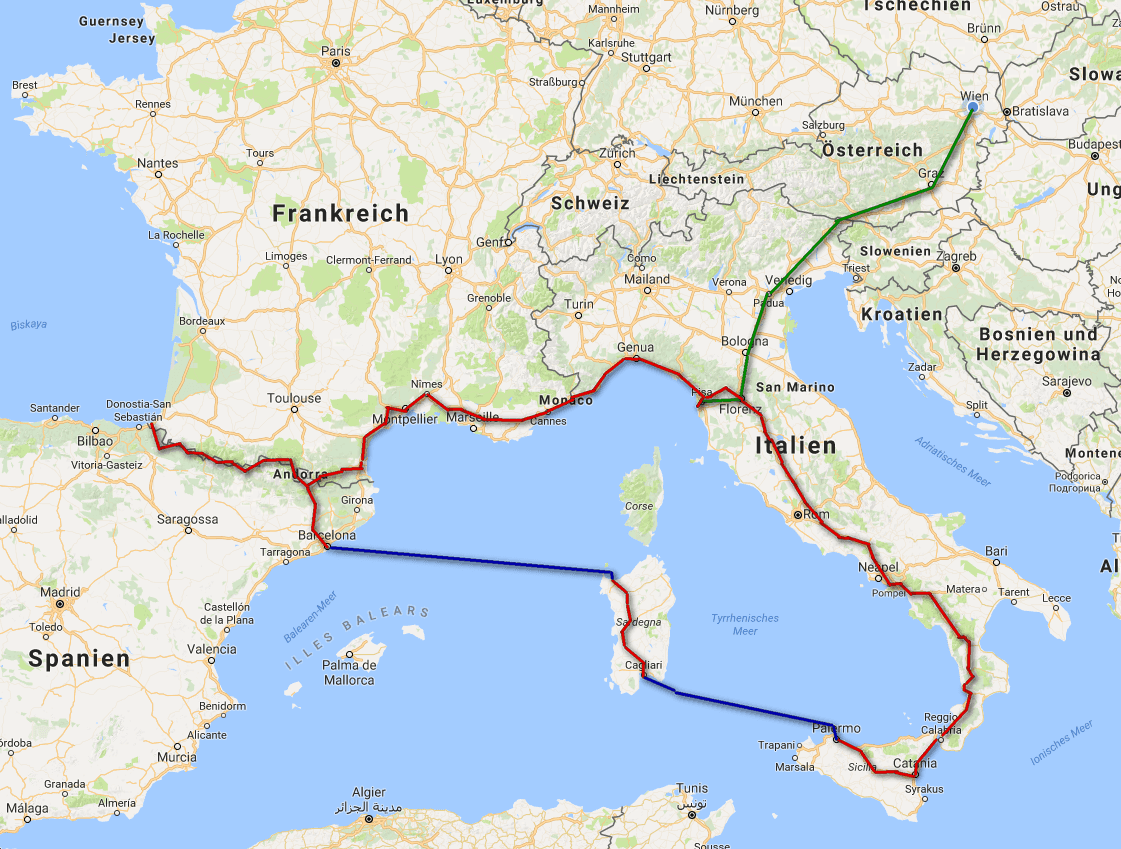 Nun, am Mittwoch den 5. Juli um 20:10 geht es also mit dem EN 1237 vom Hauptbahnhof in Wien los. Tickets sind gebucht - zweimal Autoreisezug: Anreise nach Livorno und am 29. Juni von Livorno zurück nach Wien. Eine Fährfahrt über Nacht vom 17. auf den 18. Juli von Barcelona nach Porto Torres auf Sardinien und eine Fährfahrt am 19. Juli von Cagliari nach Palermo. Das sind die Fixpunkte und sollten erreicht werden. Diese Tickets habe ich schon im Jänner gebucht, da die Jahre davor gezeigt haben, dass der Frühbucherbonus doch Einiges an Geld sparen lässt. Schwierig war die Reservierung der Fähre von Barcelona nach Porto Torres. Die Reederei war Tage über ihre Homepage nicht erreichbar und es war nicht klar, ob überhaupt gebucht werden konnte. Grimaldi Lines sind die einzige Verbindung zwischen Barcelona und Sardinien. Irgendwann war die Homepage wieder erreichbar und einer Buchung stand nichts mehr im Weg.
